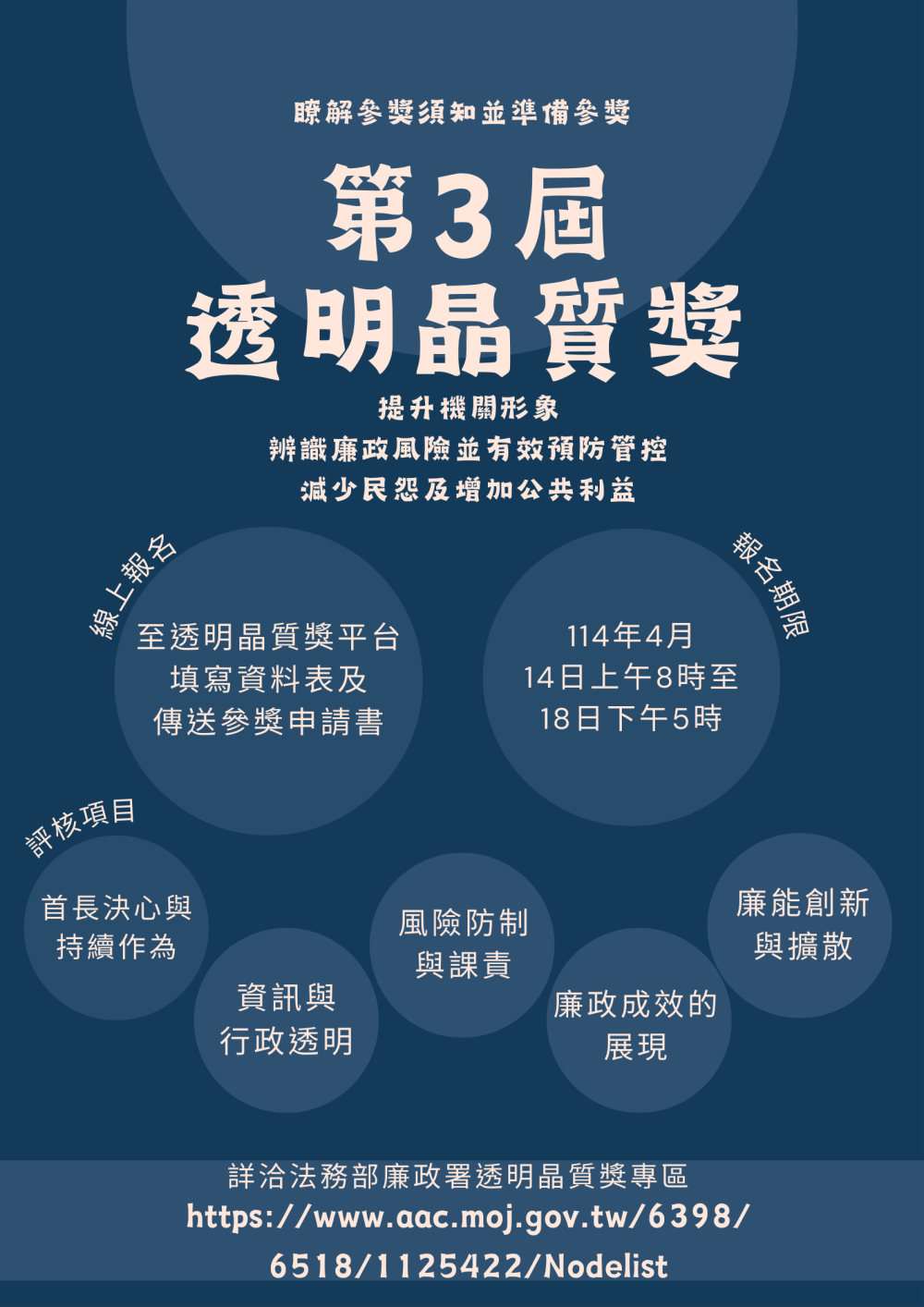 「透明晶質獎」是一套由法務部每年「以激勵措施方式對公共機構進行廉潔評估」機制,由廉政署執行,希望讓所有機關都有機會透過參與評獎檢視自身機關亮點,實現「透明晶質獎」的「激勵、承諾、實踐、參與、信賴」目標理念。